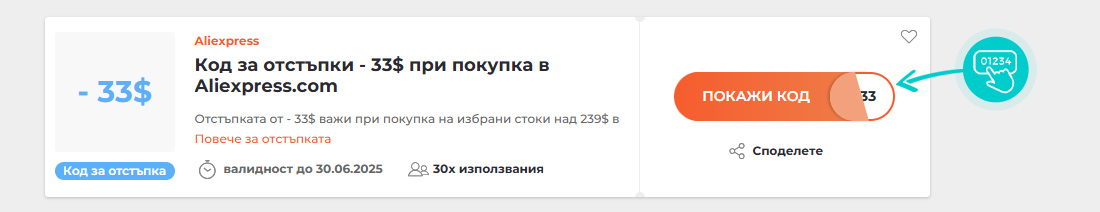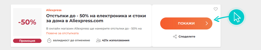Изберете конкретен код за отстъпка в нашия уебсайт, който искате да използвате в онлайн магазин Aliexpress.com. Кликнете върху оранжевия бутон „Покажи код“.