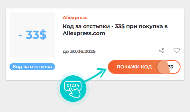 Изберете конкретна Aliexpress промоция в нашия уебсайт и кликнете върху бутона „Покажи “. Автоматично ще бъдете пренасочени директно към промоционалната оферта в онлайн магазин Aliexpress.com, където можете да закупите продукта с отстъпка.