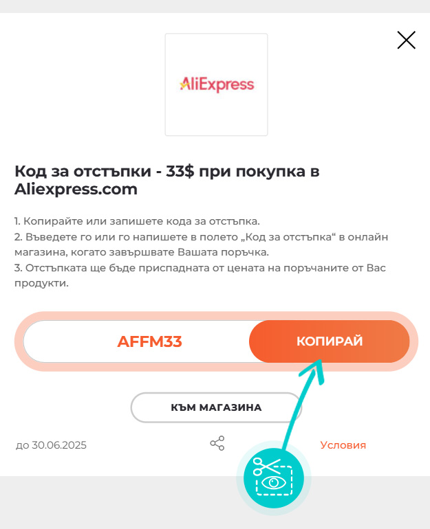 Копирайте или запишете кода за отстъпка и натиснете бутона „Към магазина“. След това ще бъдете пренасочени директно към онлайн магазин Aliexpress.com.