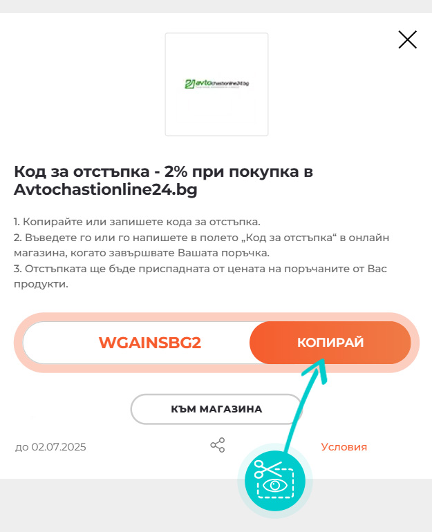 Копирайте или запишете кода за отстъпка и натиснете бутона „Към магазина“. След това ще бъдете пренасочени директно към онлайн магазин Avtochastionline24.bg.