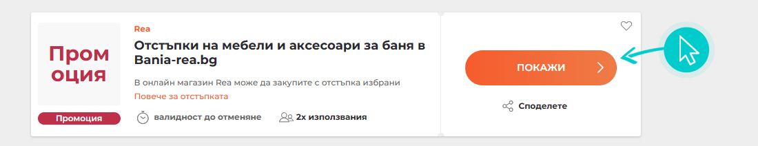 Изберете конкретна Rea промоция в нашия уебсайт и кликнете върху бутона „Покажи “. Автоматично ще бъдете пренасочени директно към промоционалната оферта в онлайн магазин Bania-rea.bg, където можете да закупите продукта с отстъпка.