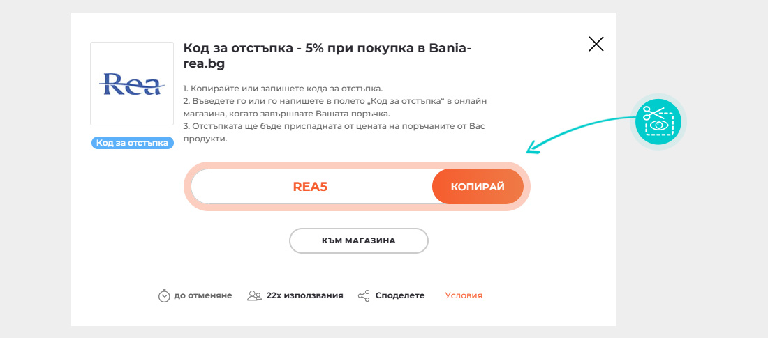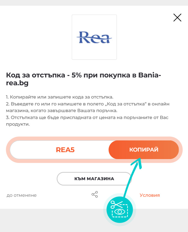 Копирайте или запишете кода за отстъпка и натиснете бутона „Към магазина“. След това ще бъдете пренасочени директно към онлайн магазин Bania-rea.bg