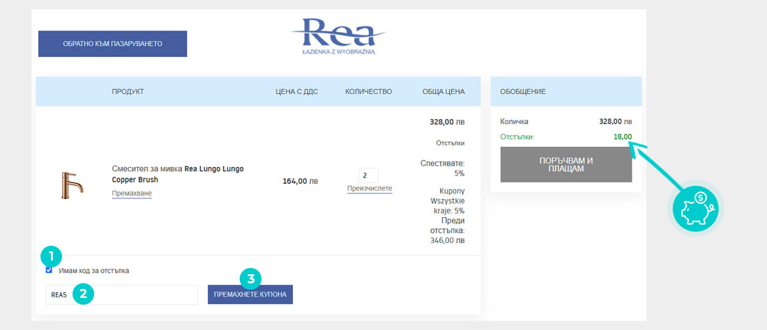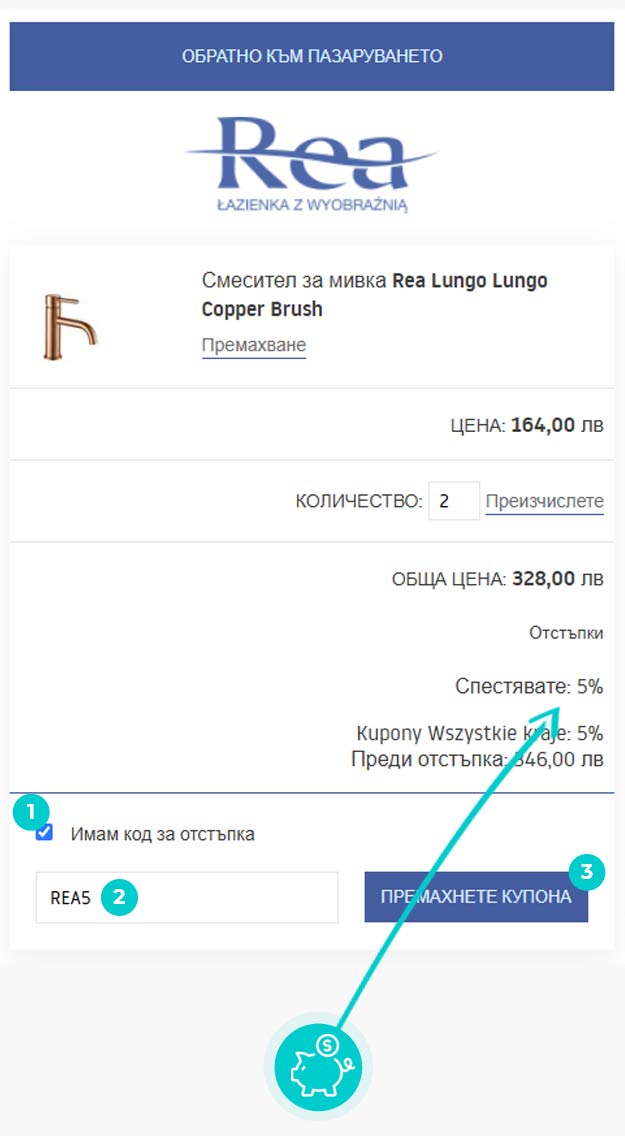 Получавате - 5% при покупка в онлайн магазин Rea, след като въведете кода за отстъпка в пазарската кошница. Използвайте Rea промокод и купете по-евтино санитария и аксесоари за баня и кухня.