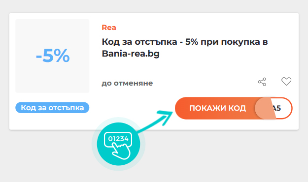 Изберете конкретен код за отстъпка в нашия уебсайт, който искате да използвате в онлайн магазин Bania-rea.bg. Кликнете върху оранжевия бутон „Покажи код“.