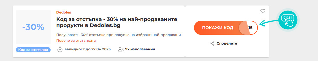Изберете конкретен код за отстъпка в нашия уебсайт, който искате да използвате в онлайн магазин Dedoles.bg. Кликнете върху оранжевия бутон „Покажи код“.