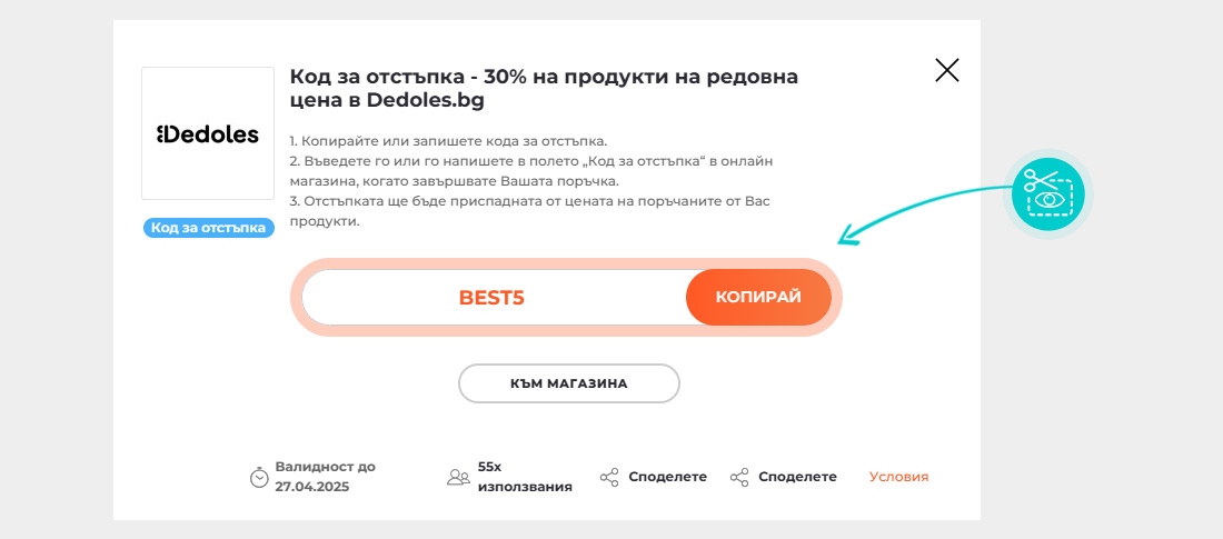Копирайте или запишете кода за отстъпка и натиснете бутона „Към магазина“. След това ще бъдете пренасочени директно към онлайн магазин Dedoles.bg
