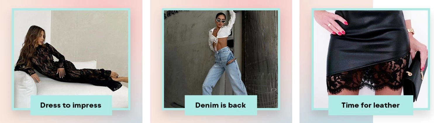 На началната страница ще видите различни категории дрехи и аксесоари, от които със сигурност може да си харесате нещо. Ако вече сте намислили какво искате да закупите, може да използвате търсачката и менюто с основни категории. Тях ще намерите в горния ляв ъгъл на сайта.