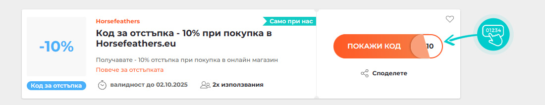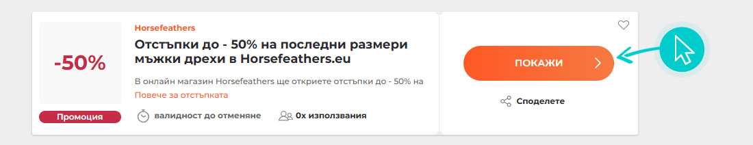 Изберете конкретен код за отстъпка в нашия уебсайт, който искате да използвате в онлайн магазин Horsefeathers.eu. Кликнете върху оранжевия бутон „Покажи код“.