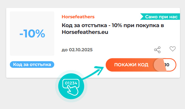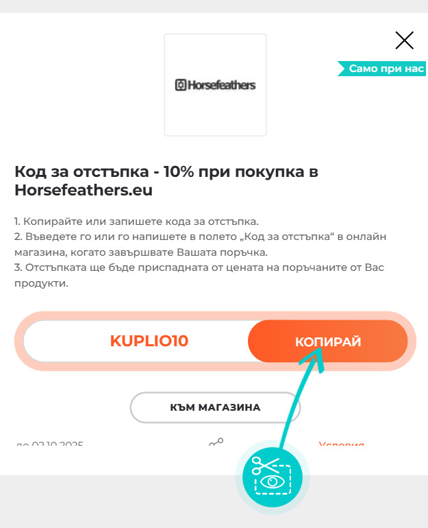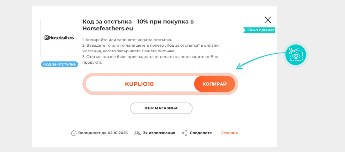 Копирайте или запишете кода за отстъпка и натиснете бутона „Към магазина“. След това ще бъдете пренасочени директно към онлайн магазин Horsefeathers.eu.