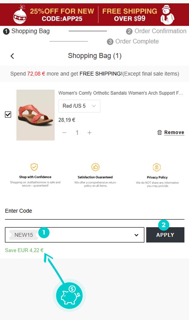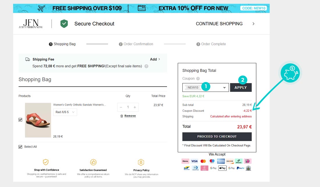 Изберете продукта в онлайн магазин Justfashionnow.com, който ви интересува, кликнете върху бутон „Add to Bag" и продуктът автоматично ще се появи в кошницата за пазаруване. В пазарската количка, в горния десен ъгъл, ще намерите поле „Coupon Discount“. Там поставете копирания код за отстъпка или го въведете ръчно и потвърдете с бутон „Apply".