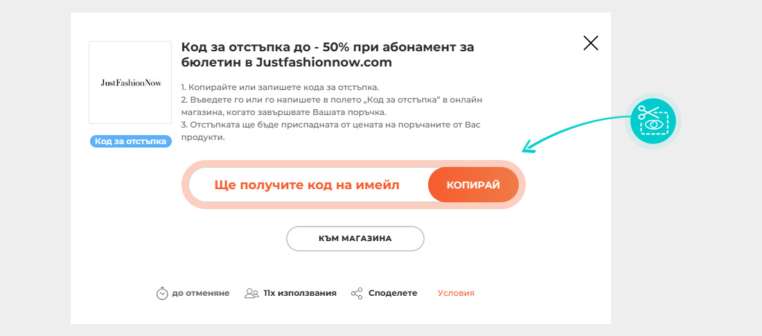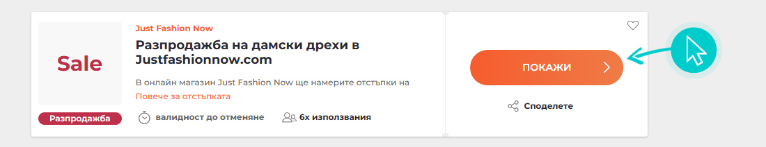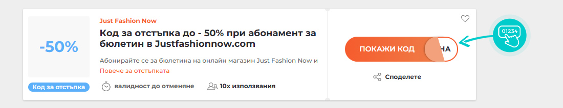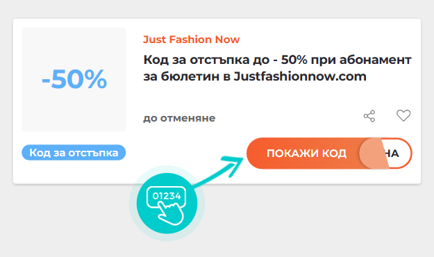 Изберете конкретен код за отстъпка в нашия уебсайт, който искате да използвате в онлайн магазин Justfashionnow.com. Кликнете върху оранжевия бутон „Покажи код“.
