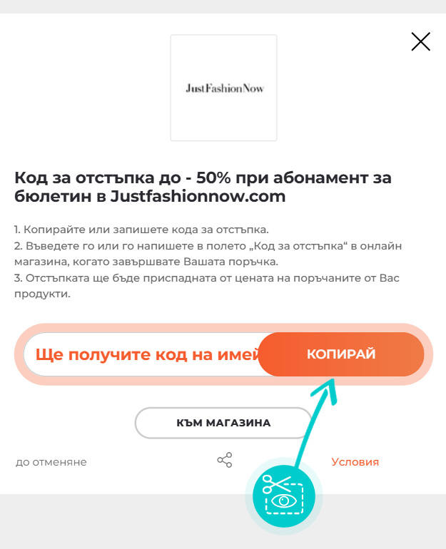 Копирайте или запишете кода за отстъпка и натиснете бутона „Към магазина“. След това ще бъдете пренасочени директно към онлайн магазин Justfashionnow.com.