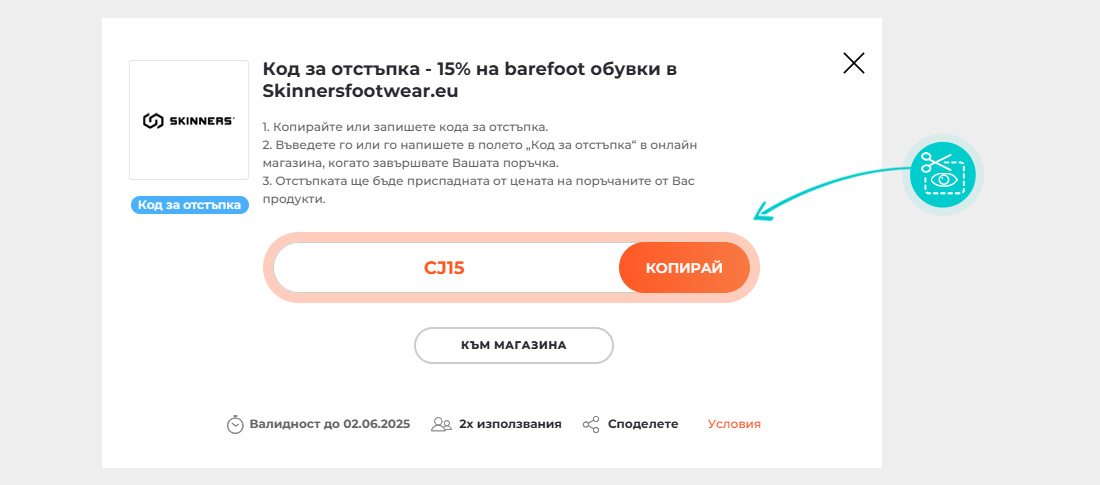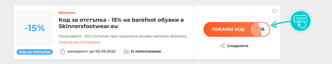 Изберете конкретен код за отстъпка в нашия уебсайт, който искате да използвате в онлайн магазин Skinnersfootwear.eu. Кликнете върху оранжевия бутон „Покажи код“.