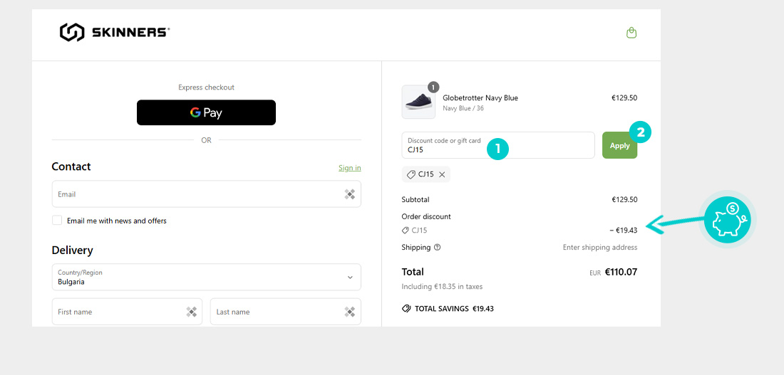 Отстъпката от 8€ важи след абонамент за бюлетин в онлайн магазин Skinners и приложен код за отстъпка, който ще получите след потвърждение на абонамента / регистрацията. Онлайн магазинът ще изпрати код за отстъпка за първа онлайн покупка на регистрирания от вас имейл. Използвайте Skinners промокод и пазарувайте по-евтино barefoot обувки.