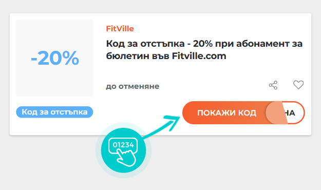 Абонирайте се за бюлетина на онлайн магазин FitVille и ще получите от тях 20% отстъпка при вашата първа онлайн покупка. Кодът за отстъпка ще бъде изпратен на вашия e-mail, регистриран в онлайн магазина.
