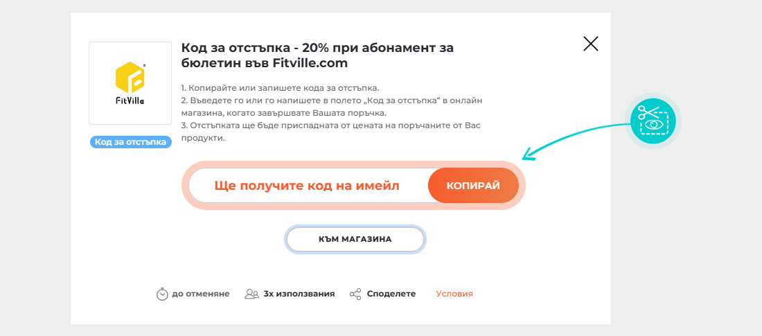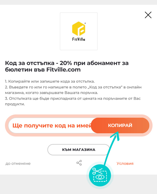 Копирайте или запишете кода за отстъпка и натиснете бутона „Към магазина“. След това ще бъдете пренасочени директно към онлайн магазин Thefitville.com.