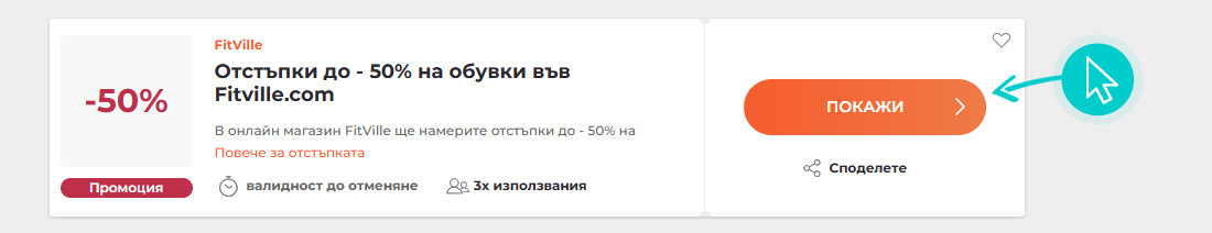 Изберете конкретна FitVille промоция в нашия уебсайт и кликнете върху бутона „Покажи “. Автоматично ще бъдете пренасочени директно към промоционалната оферта в онлайн магазин Thefitville.com, където можете да закупите продукта с отстъпка.