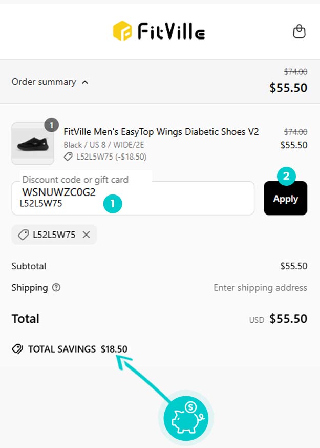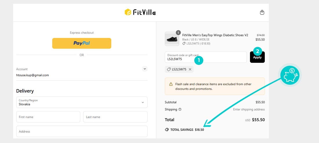 Изберете продукта в онлайн магазин Thefitville.com, който ви интересува, кликнете върху бутон „Add to Card" и продуктът автоматично ще се появи в кошницата за пазаруване. В пазарската количка, в дясната лента под списъка с продукти, ще намерите поле „Discount Code or Gift Card“. Там поставете копирания код за отстъпка или го въведете ръчно и потвърдете с бутон „Apply".