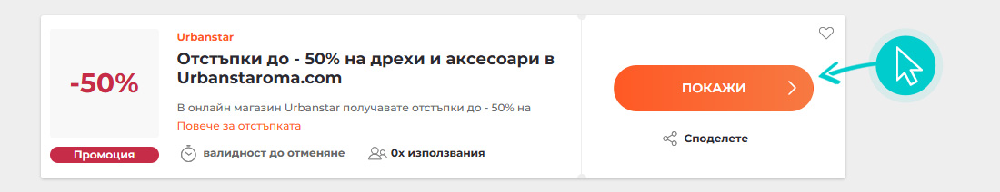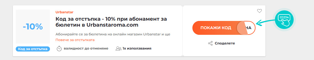 Изберете конкретен код за отстъпка в нашия уебсайт, който искате да използвате в онлайн магазин Urbanstaroma.com. Кликнете върху оранжевия бутон „Покажи код“.