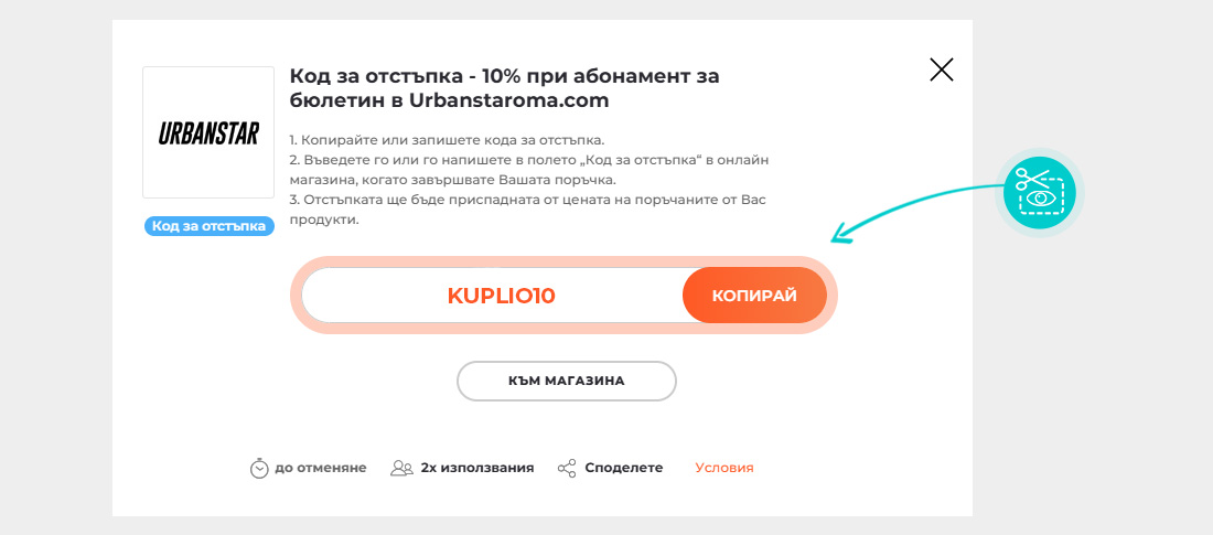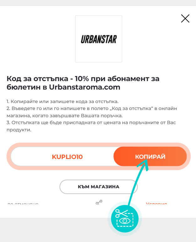 Копирайте или запишете кода за отстъпка и натиснете бутона „Към магазина“. След това ще бъдете пренасочени директно към онлайн магазин Urbanstaroma.com.